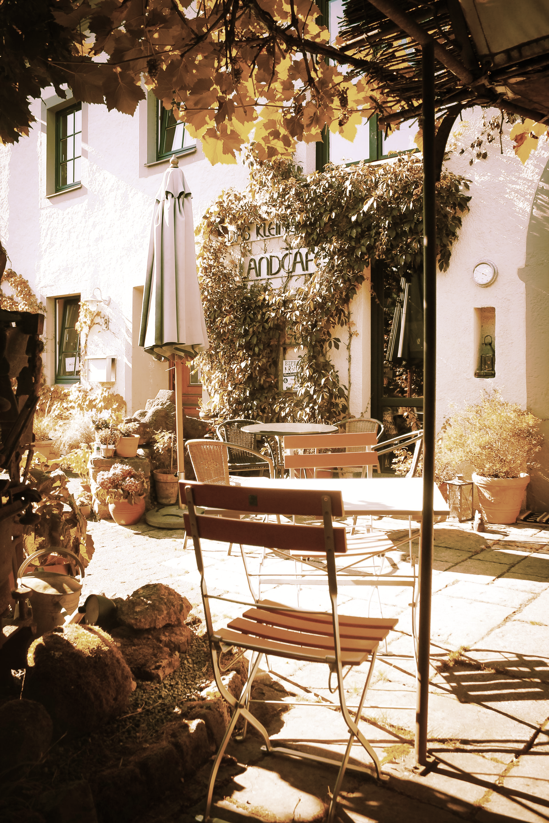 Das kleine LANDCAFE liegt in dem malerischen Dorf Kerpen mitten in der Vulkaneifel. Die liebevoll umgebaute alte Scheune bietet seit 20 Jahren Ruhe und Erholung, Kunst und Unterhaltung und Genuss in besonderer Atmosphäre. Auf der Terrasse sitzt man unter einem schattenspendenden Dach aus Wein, neben blühenden Obstbäumen und am Fuße der schönen alten Burg aus dem 11. Jahrhundert. Das kleine LANDCAFE liegt direkt am Eifelsteig, von hier aus können Sie auch verschiedene herrliche Rundwanderungen starten (z.B. die Wasserfallrunde, die „Genuss zu Fuß“-Runde, den Panoramaweg Kerpen oder den Eifelkrimi-Wanderweg). Aber auch Fahrradfahrer, Motorradfreunde und Nichtwanderer, die – frei nach Loriot – „einfach nur hier sitzen möchten“, dürfen sich bei einer Rast fühlen wie Gott in Frankreich.